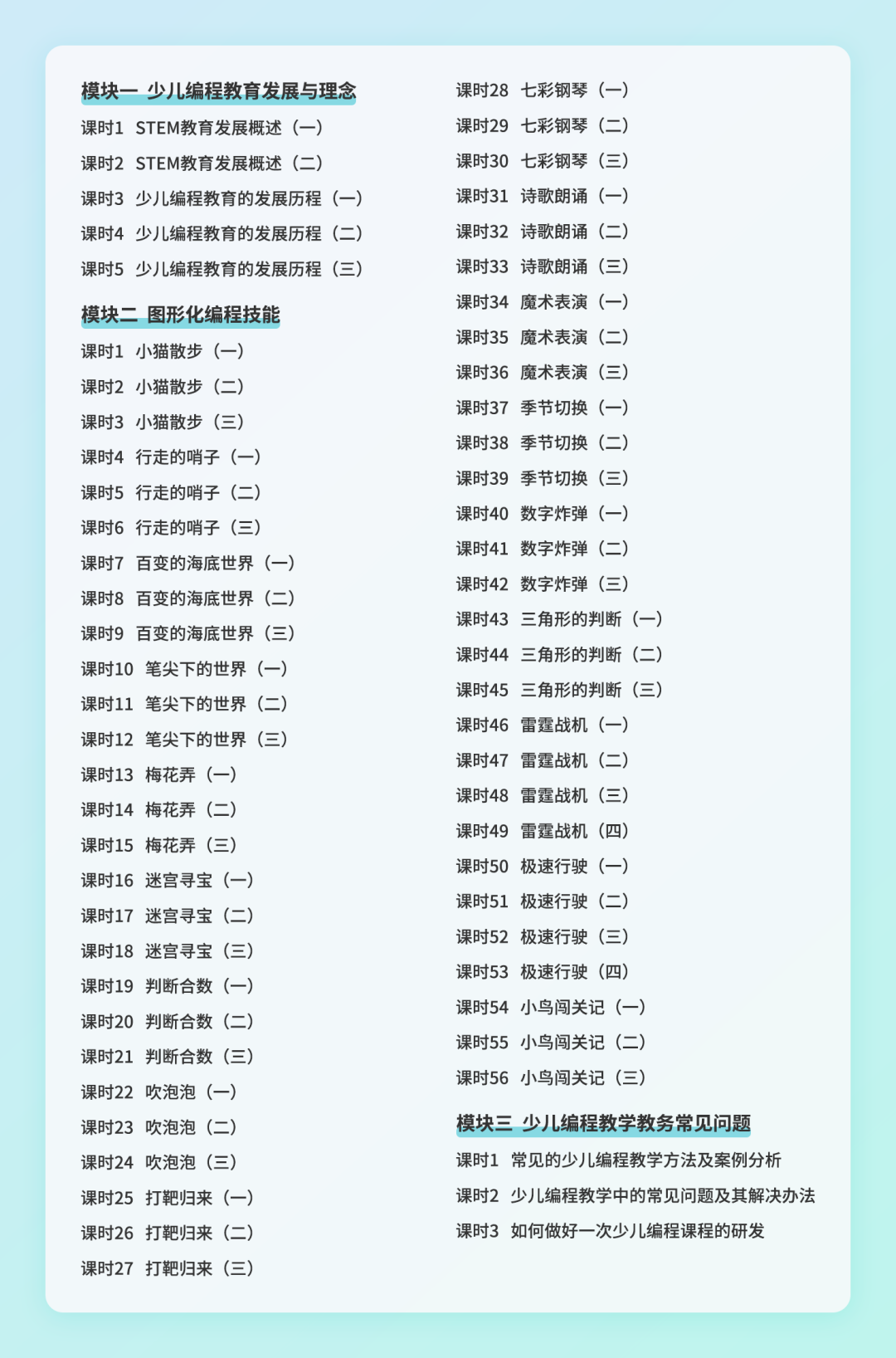 课程精心设计了三大模块,共计64课时。模块一阐述STEM教育发展以及少儿编程教育的发展历程;模块二聚焦图形化编程技能,通过如“小猫散步”“行走的哨子”等实例展开教学;模块三探讨少儿编程教学教务常见问题,提供教学指导和经验分享,帮助学员提升教学质量。