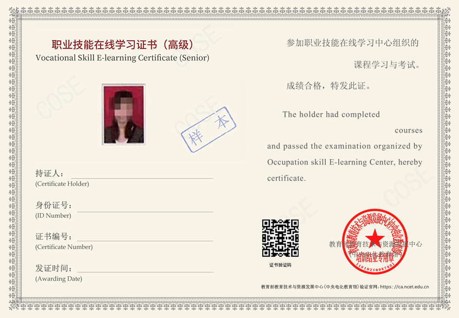 完成上述任一门课程的学习并通过考核后,学员将获得由教育部教育技术与资源发展中心(中央电化教育馆)颁发的《职业技能在线学习证书》。