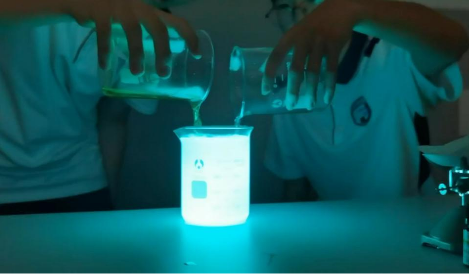第二小组的“鲁米诺”实验,鲁米诺在碱性条件下被氧化发出蓝色荧光,通过更换试剂比例得出荧光强弱与比例有关的结论,同学们学习了荧光反应原理及应用。