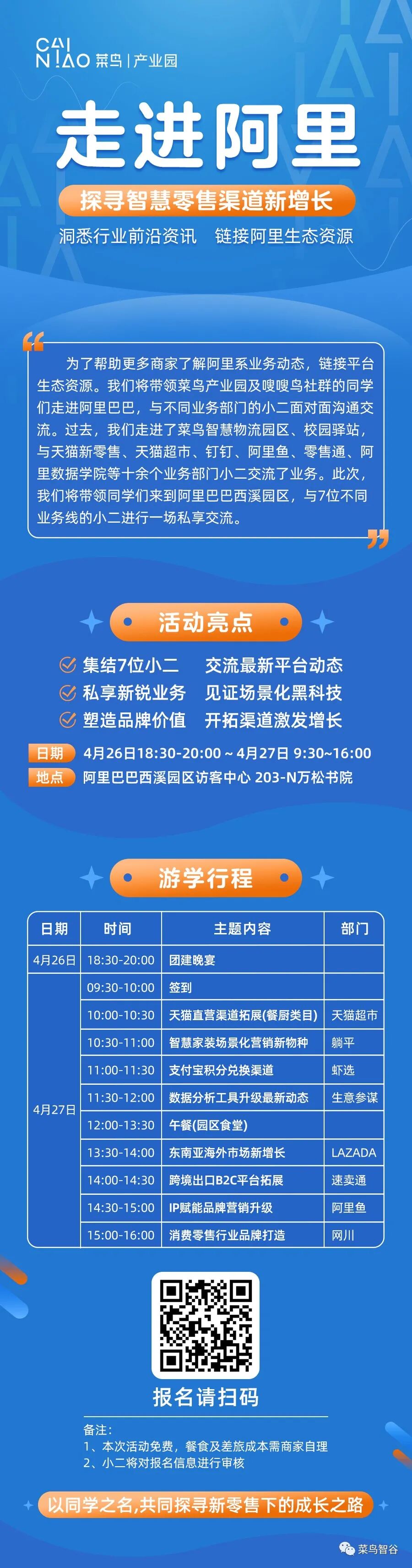 4月26日-27日,走进阿里!集结行业精英,交流最新平台动态;私享新锐业务,见证场景化黑科技;塑造品牌价值,开拓渠道激发增长;以同学之名,共同探寻新零售下的成长之路!