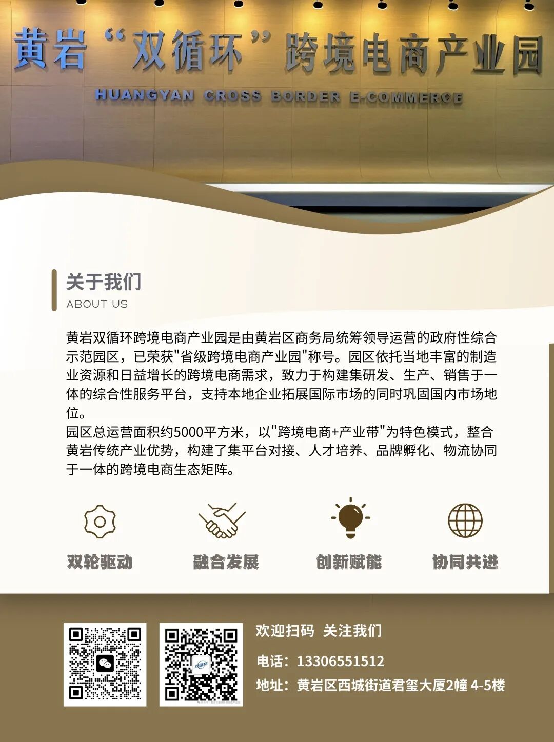 黄岩“双循环”跨境电商产业园是黄岩区重点打造的浙江省省级示范园区,以“跨境电商+产业带”为特色。联动多家主流电商平台,提供平台对接、数字化赋能、双循环联动等全链条服务,助力企业拓展全球与国内市场。