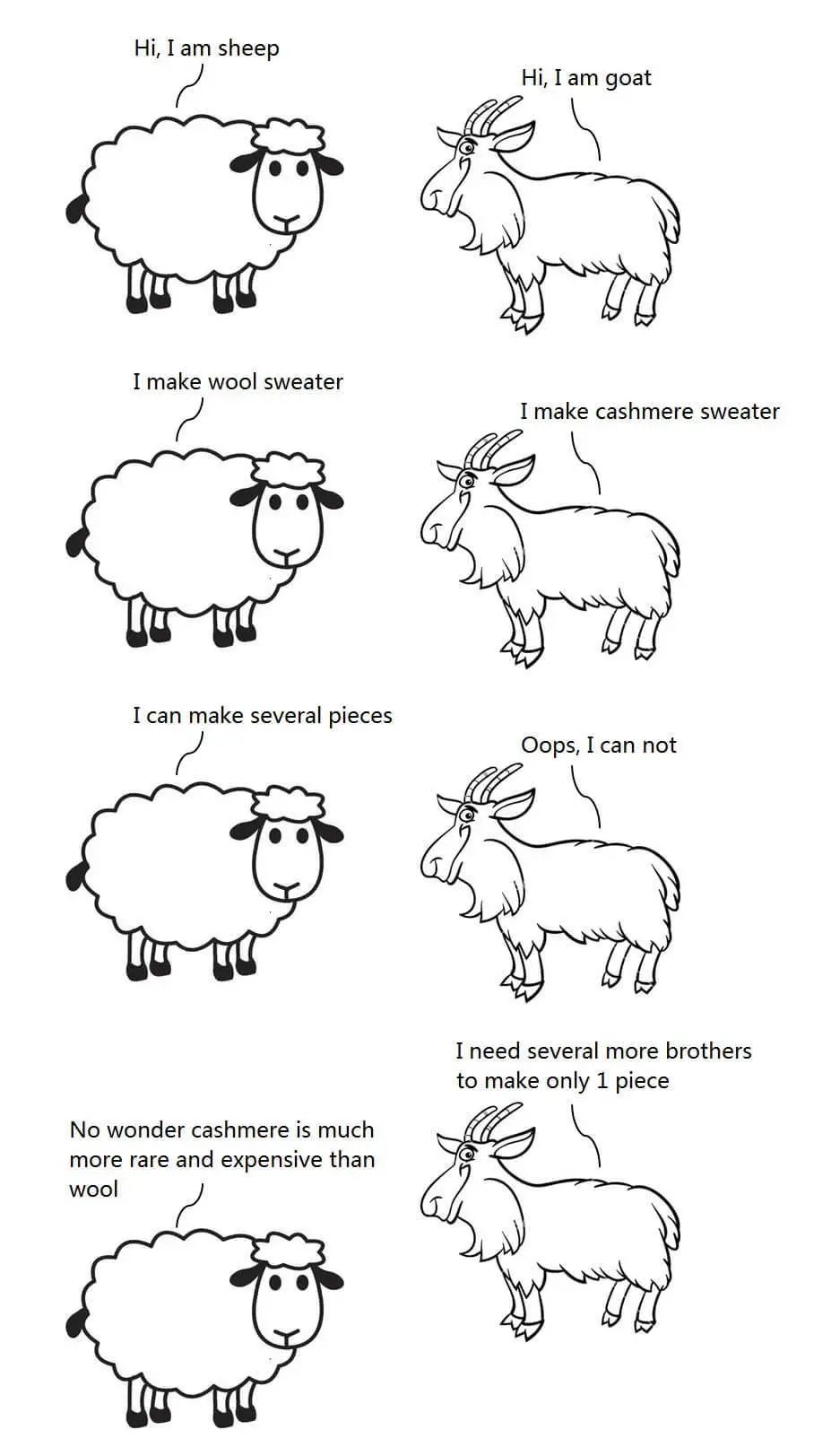 可以这么说,大部分国际奢侈品牌用的都是中国的羊绒原料。由于羊绒产量极其稀少,因此市面上一般品牌的价格也是羊绒比羊毛高出好几倍,就不要说那些奢侈品的价格了。