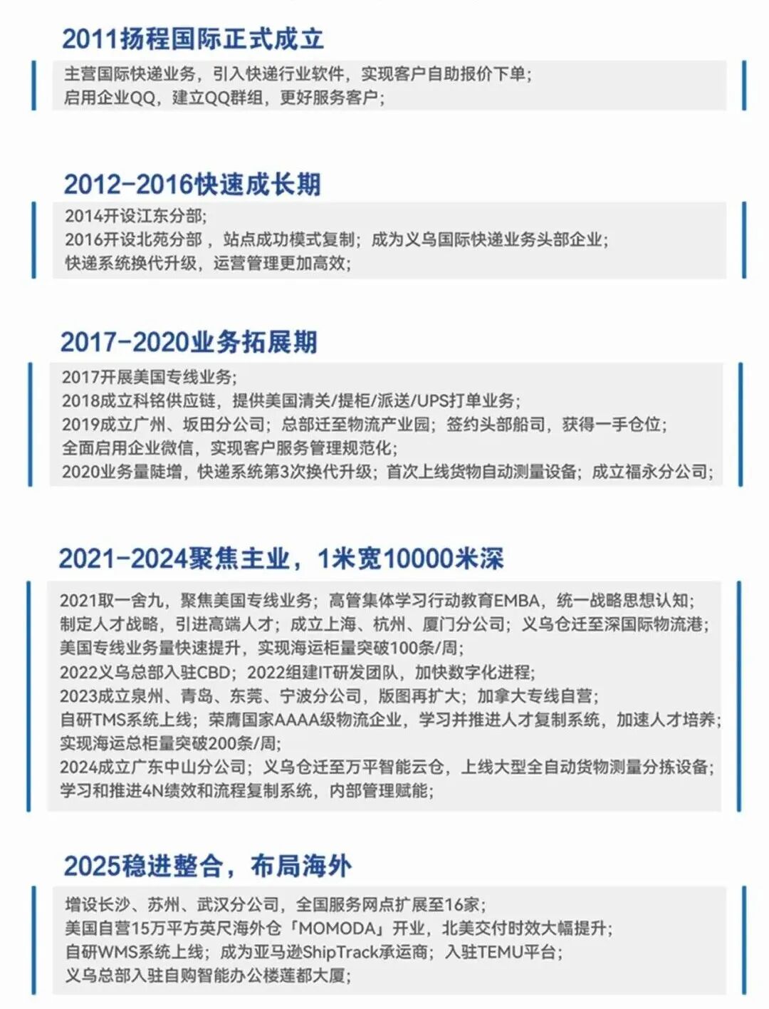 浙江扬程国际物流有限公司成立于2011年,总部位于浙江义乌核心CBD莲都大厦。作为AAAA级国际物流企业及亚马逊官方认证SPN服务商、ShipTrack承运商,公司专注于为跨境电商提供全链路一站式服务,涵盖揽收、操作、订舱、拖车、清关、海外仓及末端派送。秉持“专业、快速、安全、准时”理念,依托数字化云操作系统,实现服务在线化、流程标准化与运输可视化,助力客户高效拓展全球市场。