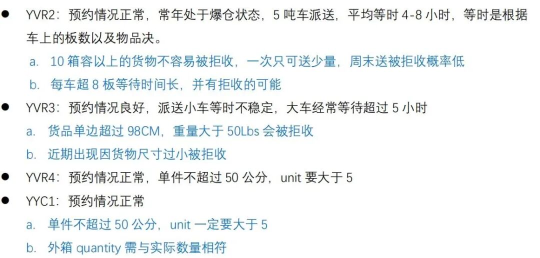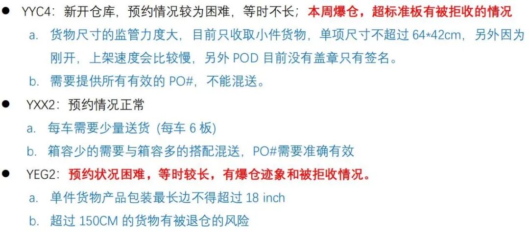 目前加线部分仓点预约困难,等时不稳定,特别是YYC6爆仓严重,建议卖家提前规划发货,灵活调整策略,优化装载,采取混送方式提升效率,并持续关注行业动态,确保物流顺畅高效。