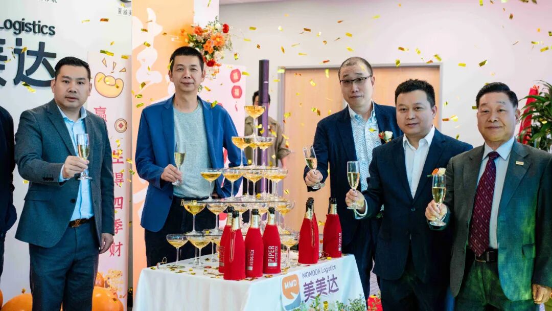 双董事长共执香槟,汩汩酒液注入水晶塔,寓意双方合作如美酒历久弥香,生生不息——以信任为基,以共赢为脉,共绘中美物流长卷新章。