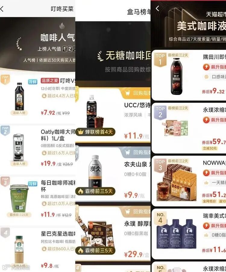 2024年夏季,叮咚买菜平台数据显示,1升装V5美式黑咖啡单周销量突破50万瓶,复购率达52%,成为饮品类目首个登顶“人气榜”的咖啡产品。同期盒马数据显示:900ml装UCC无糖咖啡占据“无糖饮料回购榜”首位,客群中25-35岁上班族占比68%,其中“家庭共享场景” 购买动机占比达41%。山姆会员店的农夫山泉炭仌咖啡更以“三瓶29元”的批发式定价,跻身新品热度榜第四,验证了 “冰箱常备咖啡” 的消费模式已从小众需求走向大众刚需。