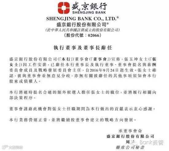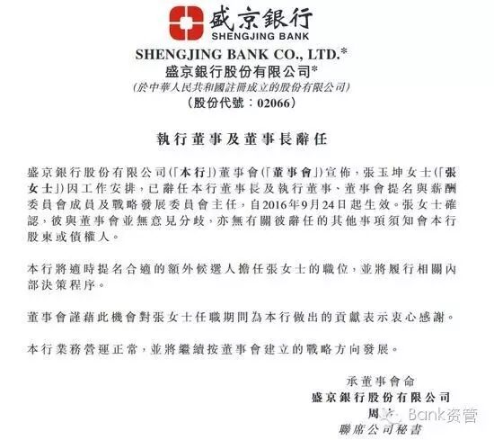 今天,盛京银行发布公告称,张玉坤因工作安排,已辞任盛京银行董事长及执行董事、董事会提名与薪酬委员会成员及战略发展委员会主任,于2016年9月24日起生效。