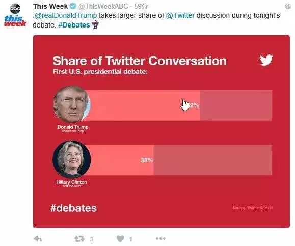 在社交媒体特朗普的关注度相当之高,推特特朗普话题的分享远超希拉里