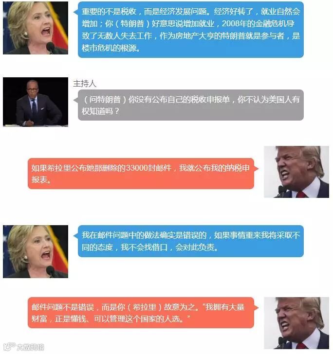 譬如,希拉里骂特朗普:特朗普你上台,跑冒滴漏全出来(Trumped up, trickle down,这个翻译对吗?),跑冒滴漏是无济于事的……然后Blablabla对特朗普指责一堆。