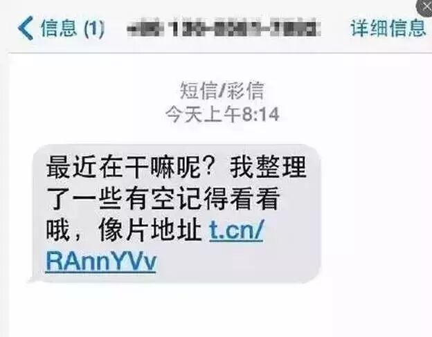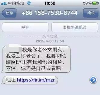 此类案件中,犯罪分子往往以威胁恐吓的语气,声称“你老公/老婆有外遇了”、“瞧瞧你做的好事”、“你朋友的手机中木马了,有照片”或者“我与你老公/老婆真心相爱,有照片为证”等,诱惑或刺激收信人点击木马网址链接。