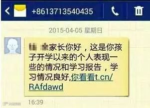 此类案件中,犯罪分子冒充学校老师,以提供给学生家长查询孩子成绩、平时表现的网址的方式,诱惑收信人点击木马网址。个别案件还会利用特殊时间节点冒充高考、期末成绩查询网址进行诈骗。