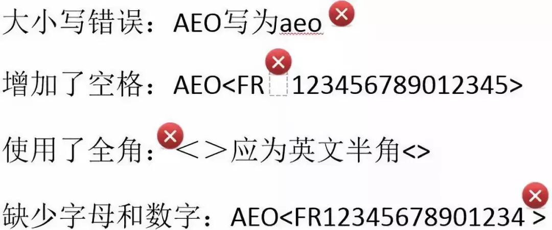 1. 英文字母要大写半角格式,AEO正确,aeo错误;