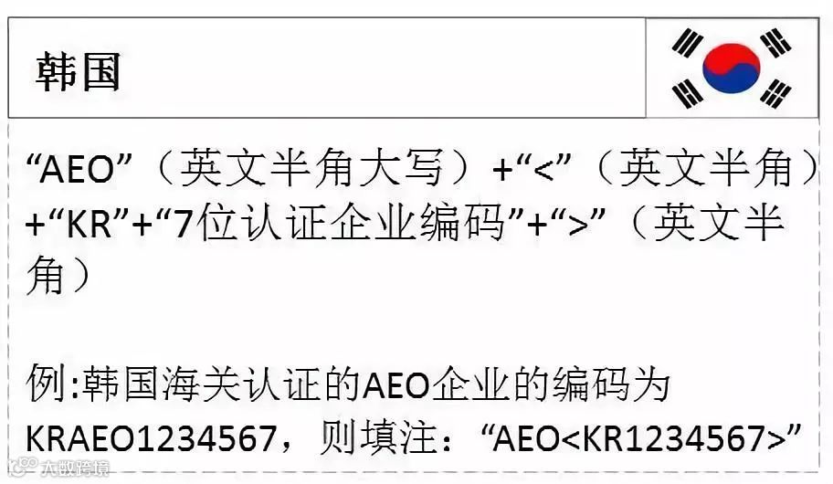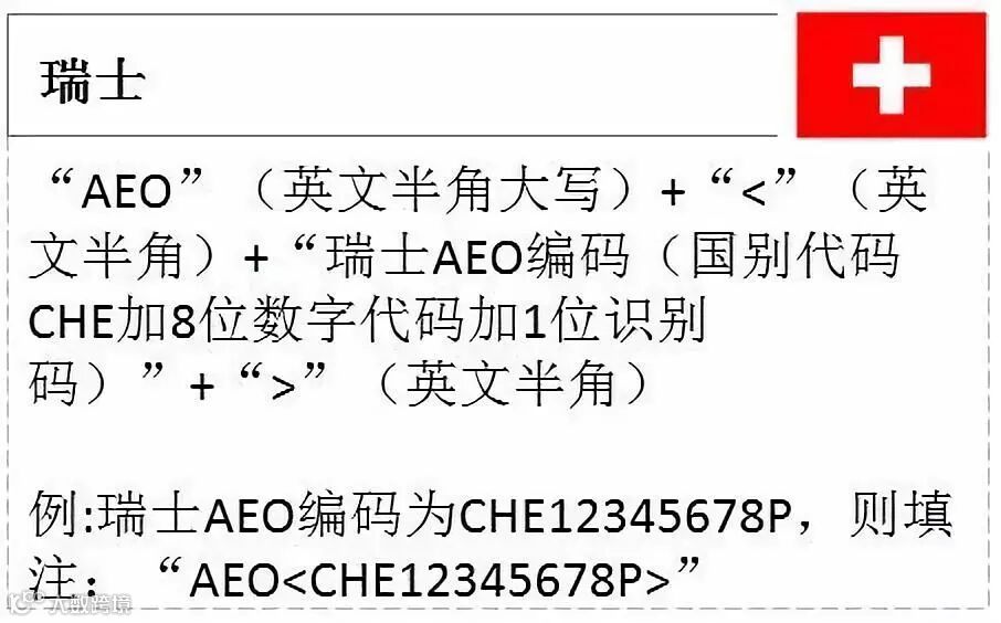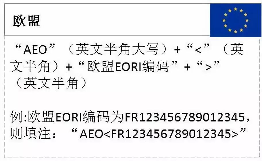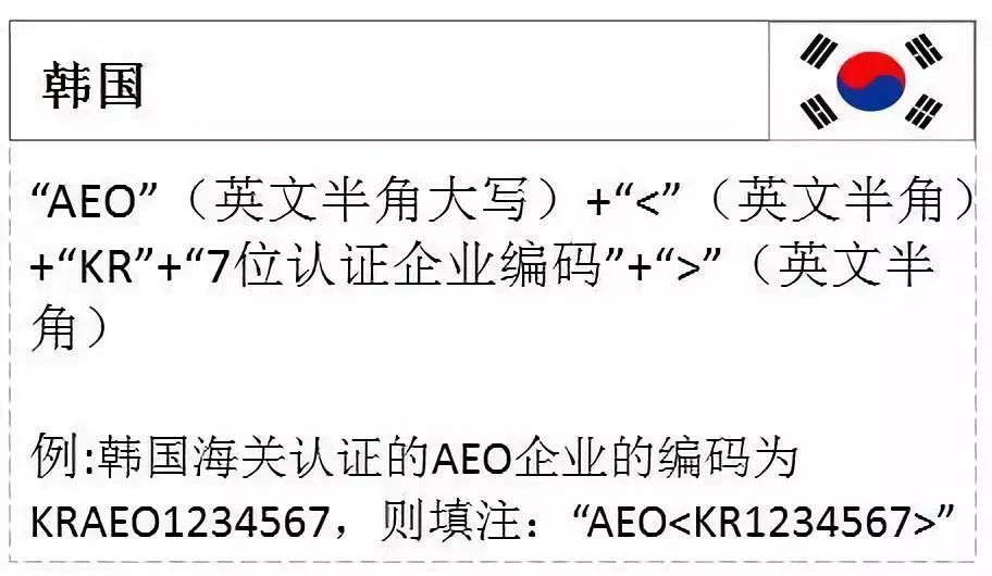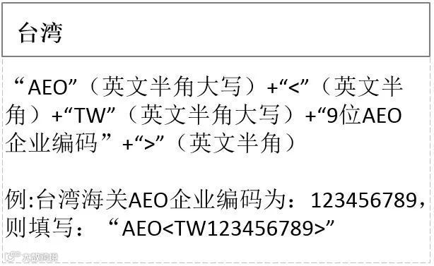 二、AEO企业编码填报样式为:“国别(地区)代码+海关企业编码”,例如:新加坡AEO企业:SG123456789012(新加坡国别代码+12位企业编码)。