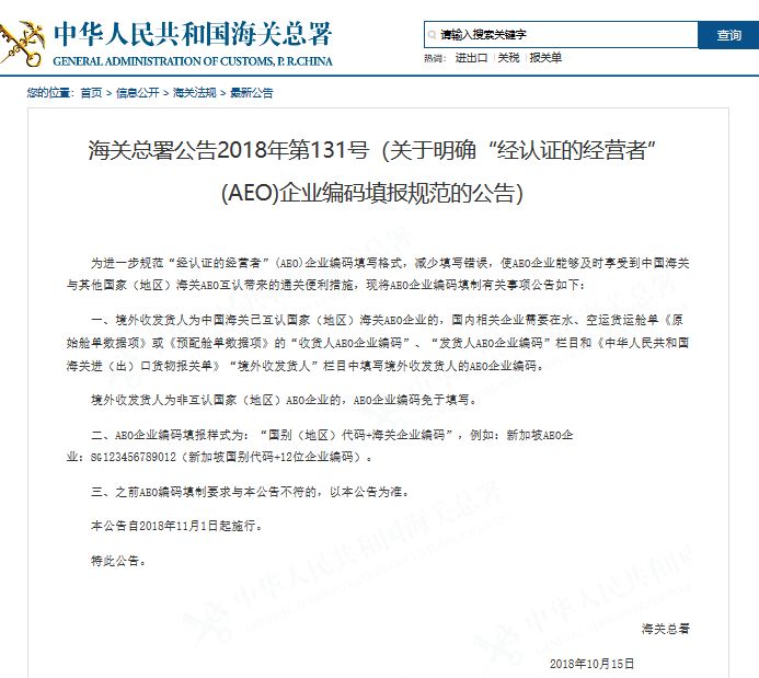 近日,海关总署发布《关于明确“经认证的经营者”(AEO)企业编码填报规范的公告》,境外收发货人填写又有新规定了,之前AEO编码填制要求与本公告不符的,以本公告为准。本公告自2018年11月1日起施行。