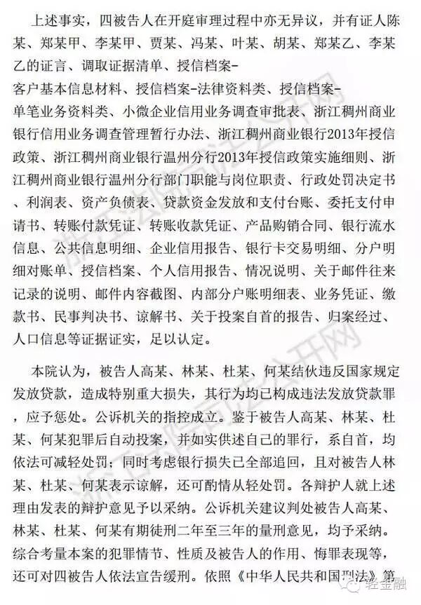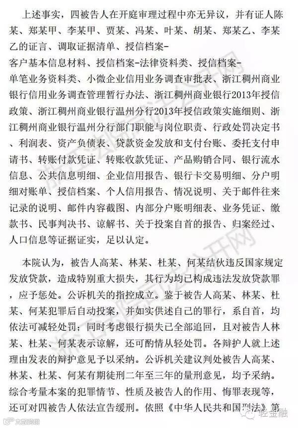 根据法院的判决,该案的稠州商业银行温州分行原业务部总经理高某被判有期徒刑3年、缓刑4年,并处罚金5万元;原业务部客户经理林某被判有期徒刑2年6个月、缓刑3年,并处罚金4万元;原授信审批部总经理杜某被判有期徒刑2年6个月、缓刑3年,并处罚金4万元;原授信审批部审查员何某被判有期徒刑2年、缓刑2年6个月,并处罚金3万元。四人罪名皆是“违法发放贷款罪”。