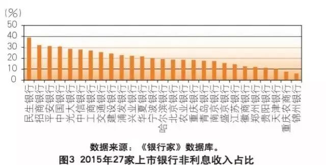 从单个上市银行数据看,不同上市银行的非利息收入占比表现出较大的差距。2015年,4家上市银行非利息收入占比超过 30%,12家上市银行非利息收入占比超过20%,13家上市银行非利息收入占比处于10%~20%之间,重庆农商行和锦州银行的非利息收入占比低于10%(见图3)。2015年,民生银行非利息收入占比达到39.0%,为27家上市银行中最高者,锦州非利息收入占比为6.2%,为27家上市银行中最低者(见图3)。此外,2015年13家上市城商行非利息收入占比均低于20%。