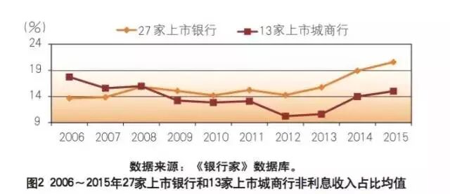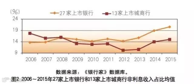 国内银行业非利息收入占比持续增加,但整体仍然偏低。从银监会统计数据看,2011~2015年商业银行非利息收入占比持续上升,但一直低于25%;2016年一季度达到26.57%,创近五年多来季度占比新高(见图1)。从各年内季度占比走势看,2016 年后三个季度,国内银行业非利息收入占比将会持续下降。从近十年上市银行数据看,2006—2013年27家上市银行非利息收入占比均值在14%~16%的通道内波动,2013年以来出现了较快速的提升,2015年达到20.6%(见图2)。13家上市城商行非利息收入占比均值表现出与27家上市银行类似的走势,自2009年以来13 家上市城商行非利息收入占比均值一直低于27家上市银行(见图 2)。2015年,13家上市城商行非利息收入占比均值增至15%, 远低于27家上市银行非利息收入占比均值。