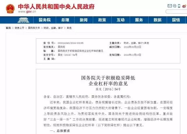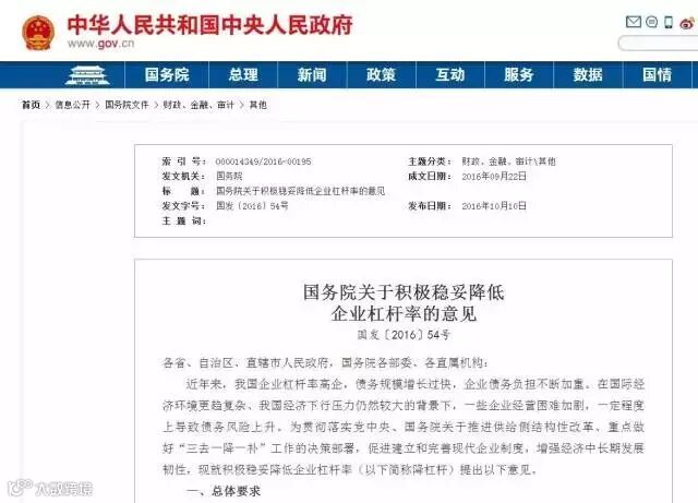 收市之后,两个极其重要的文件公布,它们是:《国务院关于积极稳妥降低企业杠杆率的意见》(国发〔2016〕54号),以及它的附件《关于市场化银行债权转股权的指导意见》。国务院新闻办还为此举行了一场高规则的新闻发布会。