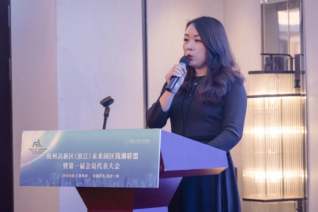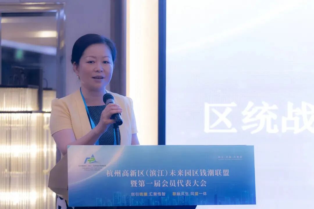 区委统战部副部长、区工商联党组书记、副主席汤茵首先祝贺联盟的成立及33家会员单位的当选,指出联盟的名称源自“创业在未来园区,居住在未来社区”,此次联盟成立旨在为产业发展做奉献,是我区园区发展的重要节点。她对今后钱潮联盟工作提出几点期待:一是立足服务,打响联盟品牌,打造高新区金名片,打造世界领先的高科技园区;二是联盟需要“走出去、引进来”,走出去交流学习对接更多资源,也将先进的产业、技术、人才引进来,将更好的资源留在高新区。三是园区间需加强共享、信息交流,真正实现共生、共融、共发展。