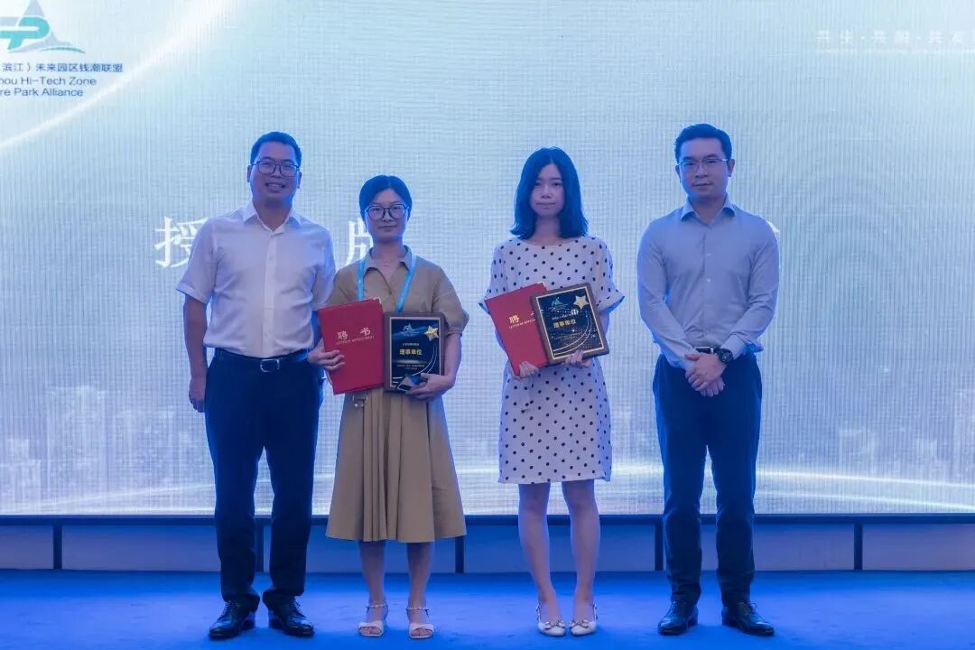 汤茵书记和王峰斌副局长为理事长单位、副理事长单位授牌。功量集团董事长施胜锡代表浙江功量创科科技有限公司上台接受钱潮联盟副理事长兼秘书长单位授牌。