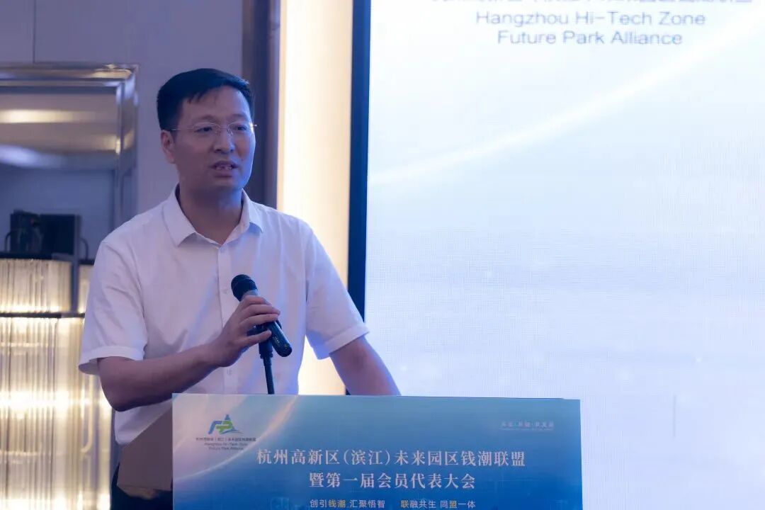 区发改局党组成员、副局长王峰斌对联盟的成立表示热烈祝贺,他在致辞中指出,高新区的核心使命是发展高科技、实现产业化。未来园区钱潮联盟的成立顺应了滨江发展的要求,园区作为高新技术产业化的发源地,提出三点希望:一是打造品牌,立足全生命周期的创新创业生态圈建设。二是做好联盟运营合规性,实现可持续发展。三是要做好软硬实力改革,以数字化改革为牵引,推进企业服务提档升级,优化营商环境。