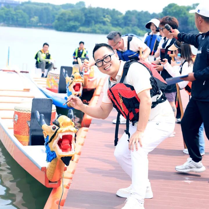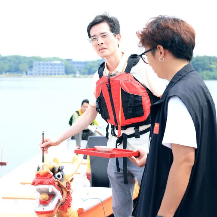 在比赛开始前,三名队长进行了庄重的点睛仪式,朱砂轻点,平安吉祥,从而龙舟也被赋予了灵魂,带着我们的美好期许准备出征!