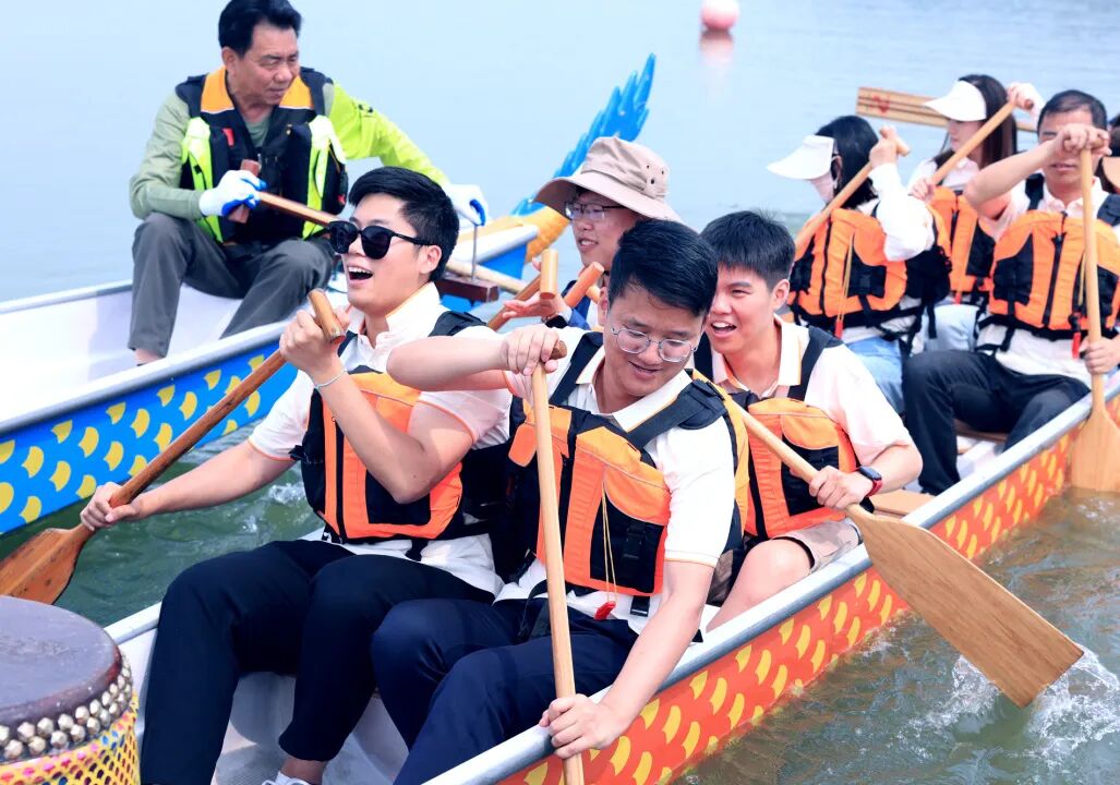 从“各划各桨”到“同频共振”,每一次整齐的划水都伴随着“一二!一二!”的呐喊,湖面上掀起阵阵激昂浪花。三支龙舟如离弦之箭破水而出!伙伴们拼尽全力,水花飞溅中,加油声、鼓点声此起彼伏。