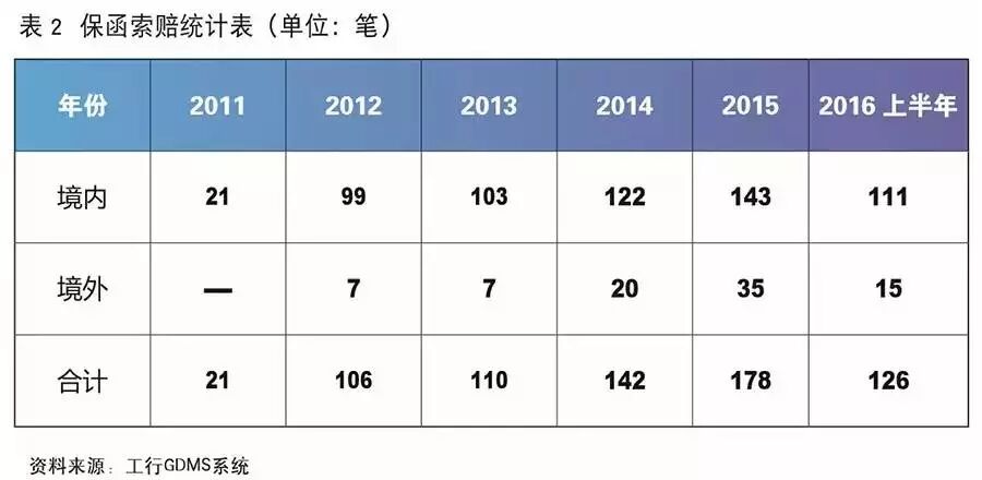 当前全球低迷的经济形势激发了市场主体的风险规避意识,放大了保函业务的市场需求,同时,也带来了保函索赔和保函纠纷的增长。近年来,工程保函、船舶保函领域的纠纷频出,给商业银行、承包商、船厂以及贸易商带来了新的挑战。保函索赔笔数也逐年增长,以工商银行的索赔统计为例(见表2),2012年和2015年收到索赔的笔数都有大幅增长,2016年形势更加严峻。商业银行需要关注保函索赔及纠纷,提升处理索赔及纠纷的专业能力。
