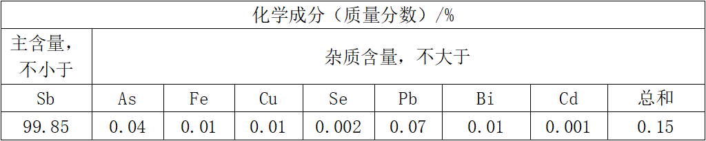 (1) 锑锭,表面应平整、整洁,不允许有浮渣、夹层及外来夹杂物。其锑含量不少于99.85%,化学成分应符合如下规定: