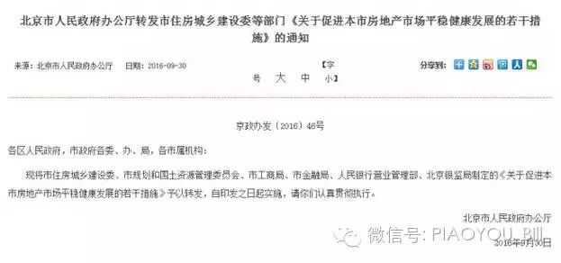 9月30日晚间,北京市政府网站挂出了北京市人民政府办公厅转发市住房城乡建设委等部门《关于促进本市房地产市场平稳健康发展的若干措施》的通知,措施自印发之日起执行。