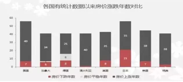 第一张图是发达国家房价涨跌各指数的对比情况。可以发现房价易涨难跌是全球普遍现象,过去半个世纪,各国房价上升的年数均明显超过下跌的年数 。