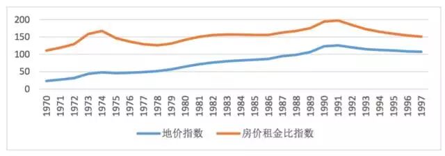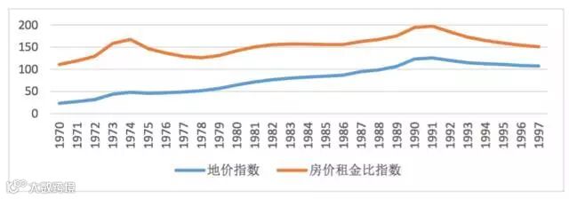 但是,这一规律在大周期阶段并不适用。以日本为例:在1970-1997年期间,日本房价租金比指数在100到200之间,有接近一倍的变动幅度。其变动方向,与地价指数基本 保持一致。