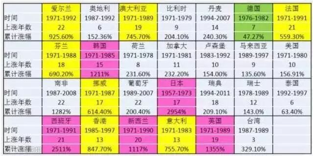 第二张图是27个可以追溯 20 年以上房价增速数据的国家和地区的数据。从图中可以看出,绝大多数国家/地区房价都出现过长期大涨的情况。除德国外,其他26个都出现过不同程度的房价繁荣,其中不乏超过我国的例子。(比如,日本在1953~1973年17年间连续上涨了30倍;韩国在1971~1985年15年间累计上涨了12倍;香港在1985~1997年13年间上涨了9倍;台湾在1987~1989年3年内累计上涨了3倍;西班牙在1971~1991年21年间累计上涨了25倍;意大利在1971~1983年13年间累计上涨了 8倍。)