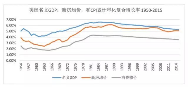 如果我们将房地产均价、消费物价、和名义GDP增速放在一起比较,可以得到以下这张图 :