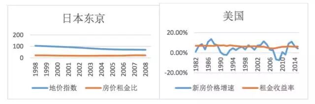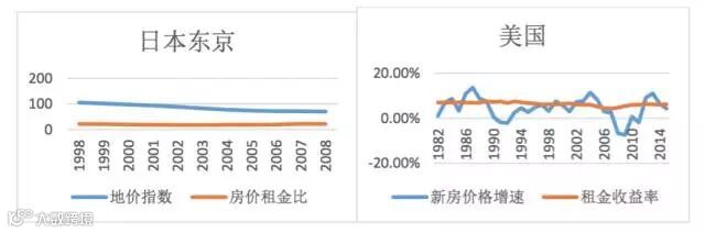 从下图可以看出,从1998到2008年,日本东京地价继续下跌了30%多,但房价租金比则始终保持稳定。同样的,从1982年到 2015年,美国新房价格涨幅有频繁变动,但租金收益率却相当稳定。