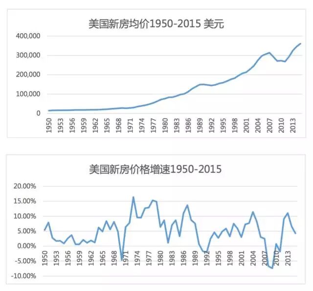 从这两张图中可以读出一些信息:从美国房地产市场历史数据看,房价长期上涨、易涨难跌。在过去 66 年,美国房产只在1970、1991-1992 和 2008-2011 期间三次下跌,其他年份全部上涨。同时,也并没有发现明显的周期性规律。每次(房产地)景气循环的时长和幅度,并无统一的规律。