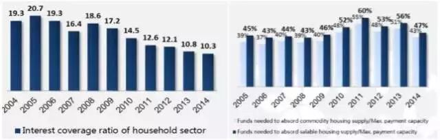 第一个指标,居民部门利息保障倍数,在2015年为10.4,按照未来十年房贷CAGR 达到20%预测,到2025年也不会突破安全边际1.5。