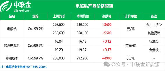 本周溧阳钴价指数继续维持向上震荡态势,成交量与订货量较上周均有明显增加趋势;本周最低报价为27.3万元/吨,最高报价为28万元/吨。溧阳中联金2509本周均价在27.02万元/吨,较上周均价上涨3400元/吨,涨幅为1.27%。本周现货市场电钴价格与溧阳中联金电钴价格整体变化趋势基本一致,价差较上周有所缩小为2100元/吨。主要原因是多数钴盐厂商也开始暂停报价,业者看涨心态持续。
