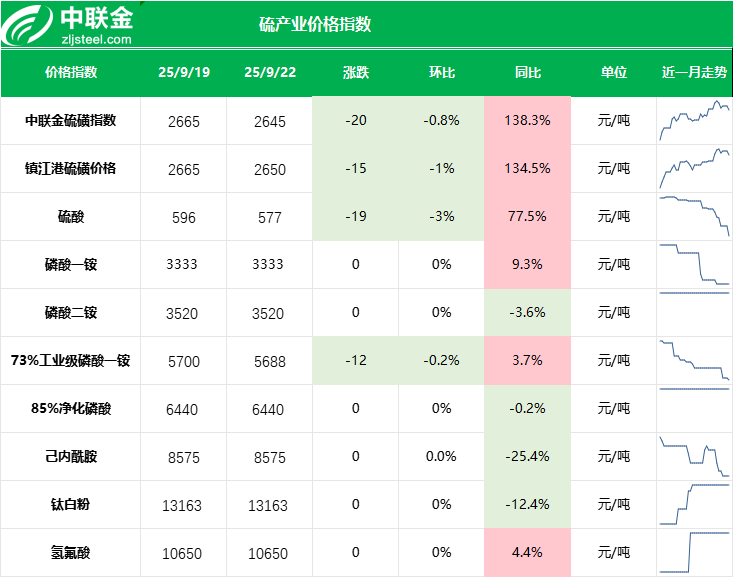 上一工作日中联金硫磺指数最新价格为2645元/吨,环比下跌20元/吨,跌幅0.8%。近期硫酸价格下行延续而下游肥企减产需求不佳的预期逐步提升,下游采购观望情绪较浓。盘面弱势震荡,国际货源供需紧张,尚有一定支撑,关注卡塔尔招标价格是否有托底,在缺乏明显利多驱动的情况下,预计盘面价格维持震荡态势。上一工作日订货量88234(+996吨)。现货方面:上一工作日主营炼厂硫磺稳价,普光万州稳价2570元/吨。大连某炼厂今日招标起拍价2490元/吨,环比下跌40元/吨。山东地区地炼液硫市场弱稳,硫酸价格下滑,市场采购情绪有所影响, 主流价格2580-2585元/吨。长江沿线,节前补货氛围清淡,成交氛围低迷,价格顺势下行,成交价格2650元/吨。上一工作日国内港口固体硫磺现货总库存236.7万吨,较前日增加0.7万吨。
