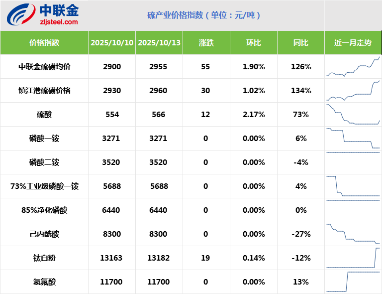 上一工作日中联金硫磺均价为2955元/吨,环比上涨55元/吨,涨幅1.9%。受外盘坚挺带动,国内市场跟涨情绪明显,盘面走势偏强。海外货源持续紧俏,进口到岸成本高企,支撑现货价格维持坚挺。昨日订货量112666(-664吨)。现货方面,主营炼厂报价大体持稳,普光万州稳价2670元/吨,大连某炼厂今日招标起拍价2790元/吨,环比上调200元/吨。山东地炼液硫出货平稳,炼厂高端惜售情绪延续,报价略上调至2600-2630元/吨。长江沿线成交活跃,成交价在2960-2980元/吨。国内港口固体硫磺库存238.8万吨,较前日增加6.8万吨。
