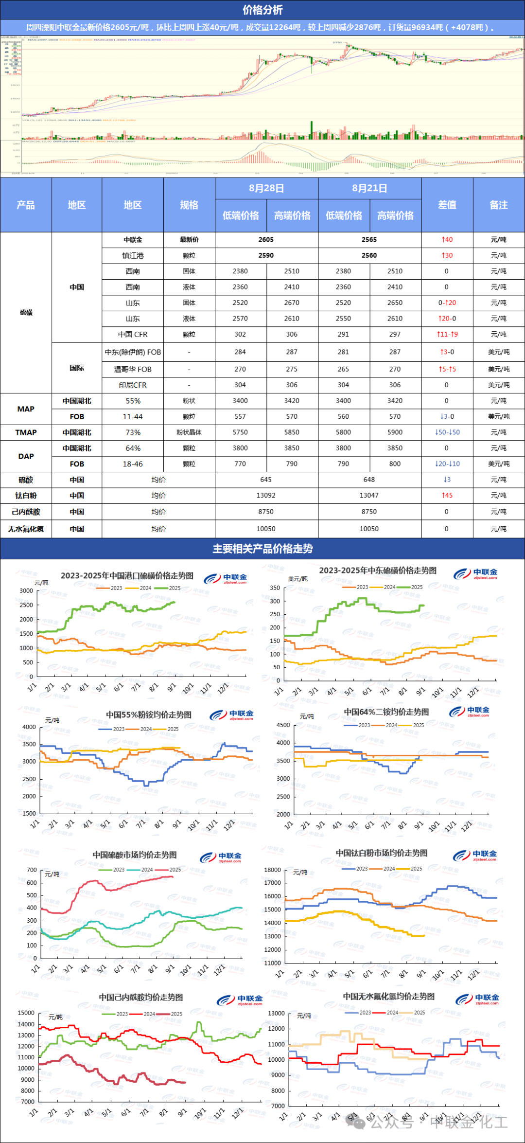 1.周四溧阳中联金最新价格2605元/吨,环比上周四上涨40元/吨,成交量12264吨,较上周四减少2876吨,订货量96934吨(+4078吨)。盘面偏强震荡,传统下游处于秋季旺季等因素影响,需求持续偏强,9月份预计硫磺到货量仍然维持中性偏下水平,市场供小于求的格局难以扭转,预计短期价格易涨难跌。但下游行业成本承压下,硫磺价格上行高度有限,中长期需等待契机。