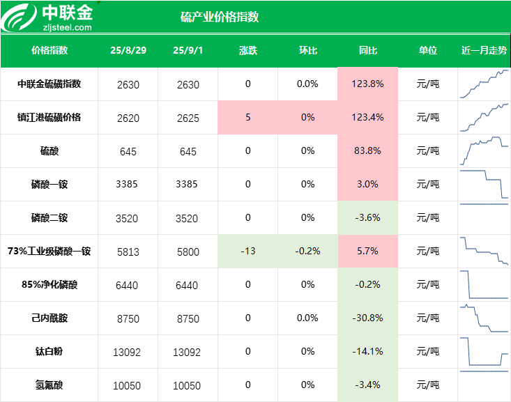 上一工作日中联金硫磺指数最新价格为2630元/吨,环比持平。昨日盘面小幅震荡,在无新的消息刺激下,购销双方观望情绪,盘面成交量缩量,短期依然关注基本面结构,市场供小于求的格局难以扭转,预计短期价格易涨难跌。但下游行业成本承压下,硫磺价格上行高度有限,中长期需等待契机。上一工作日订货量95834(-1304吨)。现货方面:上一工作日主营稳价,普光万州2510元/吨。大连某炼厂今日起拍价为2480元/吨,关注中标结果。山东地区地炼液硫行情震荡,出货顺畅,但价格上行亦有难度,主流价格2570-2615元/吨。长江沿线,工厂正常备货采购,但贸易商之间互动减少,情绪偏观望,成交价格上行至2625元/吨,今日关注某大厂采购招标结果以及国产硫磺调价动态。上一工作日国内港口固体硫磺现货总库存227.1万吨,较前日减少3.4万吨。