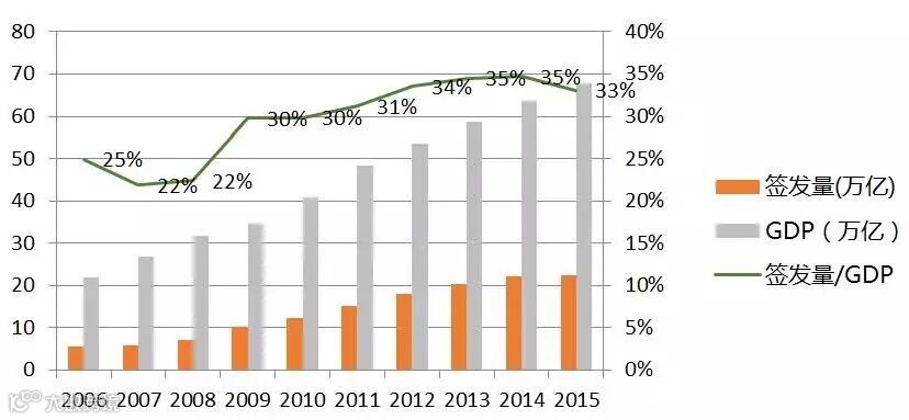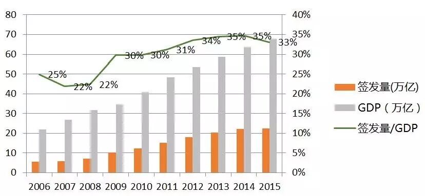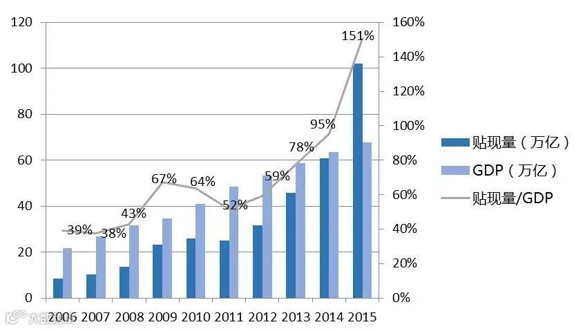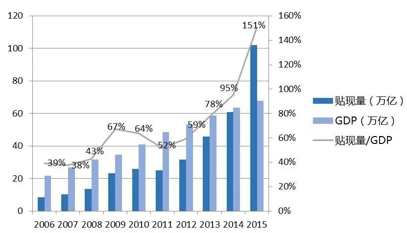 笔者统计了2006-2015年十年的数据,发现随着GDP的增加,票据签发量增速放缓,占GDP比重趋于平缓与35%。而贴现的需求保持旺盛增长,贴现占GDP的比重由39%增长到151%,增长势头丝毫不减,展示出旺盛的票据交易需求。详情见下图所示: