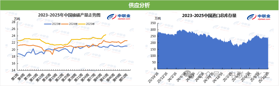 1.本周中国硫磺周产量数据为24.3万吨,华东复产以及四川天然气脱硫装置产量爬坡,周度产量增加300吨。