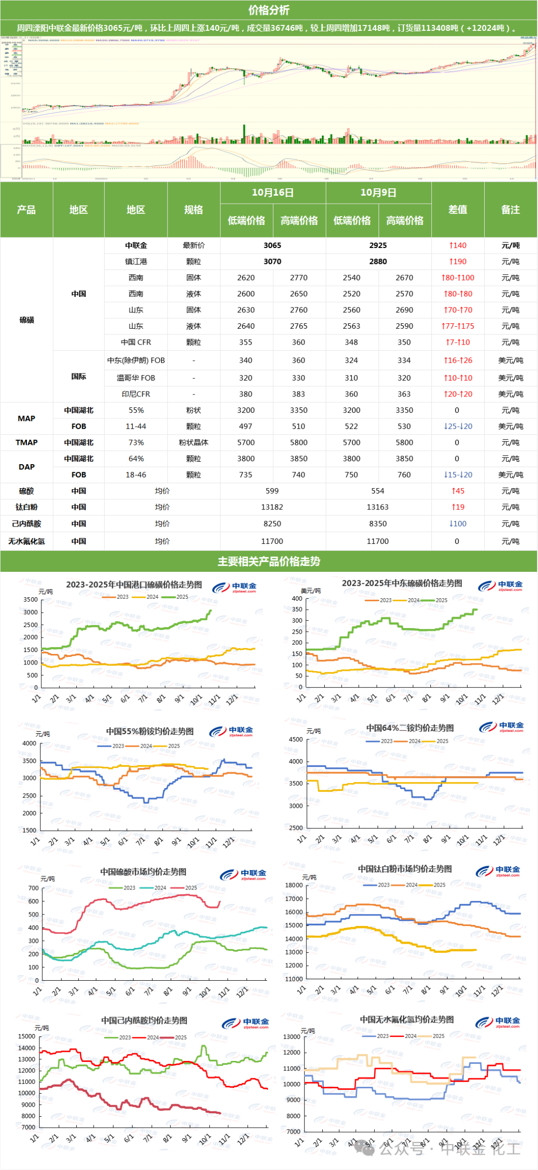 1.周四溧阳中联金最新价格3065元/吨,环比上周四上涨140元/吨,成交量36746吨,较上周四增加17148吨,订货量113408吨(+12024吨)。本周硫磺价格强势突破3000元/吨整数位。供需基本面来看,主要是外盘强劲的需求以及俄罗斯供应层面的扰动。国内港口价格倒挂外盘,因此行情主要补涨为主。