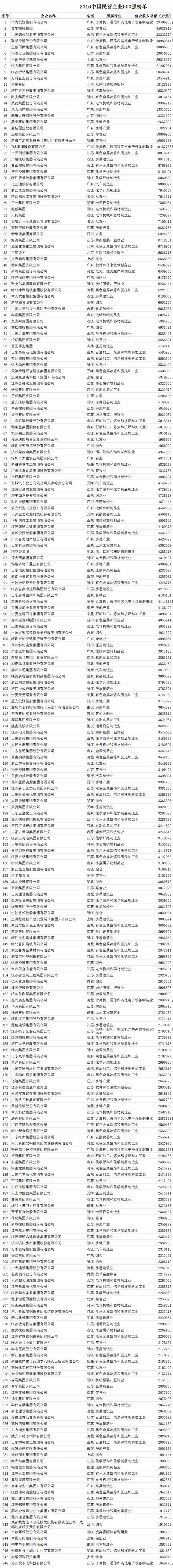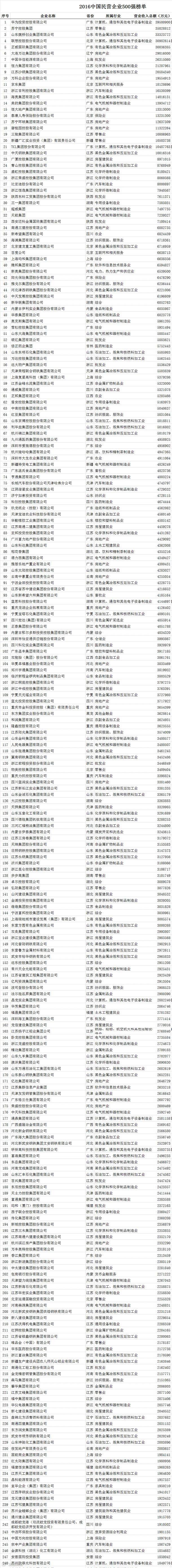 2016中国民营企业500强榜单
