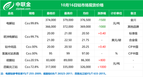 现货市场,国内电钴报价窄幅下探,欧洲市场电钴报价继续小幅上探,当前海外原料端价格持续抬升,氢氧化钴系数已抬升至95-99%,成本支撑力度持续走强,电钴现货市场多数主流厂商仍保持暂停对外报价策略,多数贸易商恢复正常报价,当前价格对下游需求形成一定抑制,市场实际成交订单有所减少。据中联金了解,今日金川钴现货报价37.4-37.9万元/吨,其他品牌电钴报价36.6-37.2万元/吨,欧洲标准级电钴报价20-21美元/磅,合金级电钴报价21-22.5美元/磅,钴中间品CIF中国报价20-20.5美元/,硫酸钴报8.36-8.9/吨,四氧化三钴报价31.7-33.5万元/吨。
