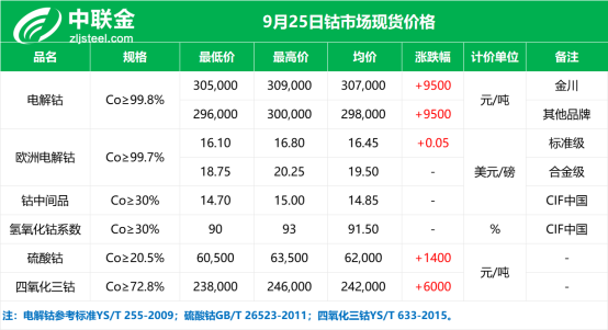 现货市场,国内电钴报价继续大幅抬升,欧洲市场电钴报价也窄幅上行,当前海外原料端价格高位企稳,氢氧化钴系数再次上调至90-93%,成本支撑力度持续走强,电钴现货市场多数主流厂商仍保持暂停对外报价策略,多数贸易商仍处于封盘不报价状态,节前业者捂货惜售情绪高涨。据中联金了解,今日金川钴现货报价30.5-30.9万元/吨,其他品牌电钴报价29.6-30万元/吨,欧洲标准级电钴报价16.1-16.8美元/磅,合金级电钴报价18.75-20.25美元/磅,钴中间品CIF中国报价14.7-15美元/,硫酸钴报6.05-6.35/吨,四氧化三钴报价23.8-24.6万元/吨。