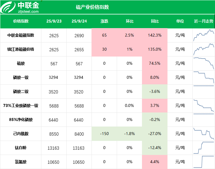上一工作日中联金硫磺指数最新价格为2690元/吨,环比上涨65元/吨,涨幅2.5%。市场传言卡塔尔3.5万吨固体硫磺招标中标价格为FOB333美元/吨。刺激国内贸易商惜售心态愈发坚挺,需求端对未来补货比较担忧,积极推升询盘价格,昨日现货成交也不断上行,支撑行情强势上行。上一工作日订货量89624(-594吨)。现货方面:上一工作日主营炼厂硫磺多数稳价,普光万州稳价2570元/吨。大连某炼厂今日招标起拍价2490元/吨,环比持平。山东地区地炼液硫市场弱稳,未出现明显变化,主流价格2580-2590元/吨。长江沿线,现货市场昨日积极买涨,买盘不断推高价格,卖盘报盘较少,成交价格2655元/吨。上一工作日国内港口固体硫磺现货总库存236万吨,较前日减少1.7万吨。