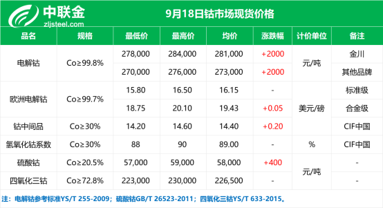 现货市场,国内电钴报价窄幅上行,欧洲市场电钴报价继续小幅上探,当前海外原料端价格持续上调,成本支撑力度持续走强,电钴现货市场多数主流厂商仍保持暂停对外报价策略,受政策不确定担忧情绪影响,部分贸易商出货意愿继续增强。据中联金了解,今日金川钴现货报价27.8-28.4万元/吨,其他品牌电钴报价27-27.6万元/吨,欧洲标准级电钴报价15.8-16.5美元/磅,合金级电钴报价18.75-20.1美元/磅,钴中间品CIF中国报价14.2-14.6美元/,硫酸钴报5.7-5.9/吨,四氧化三钴报价22.3-23万元/吨。